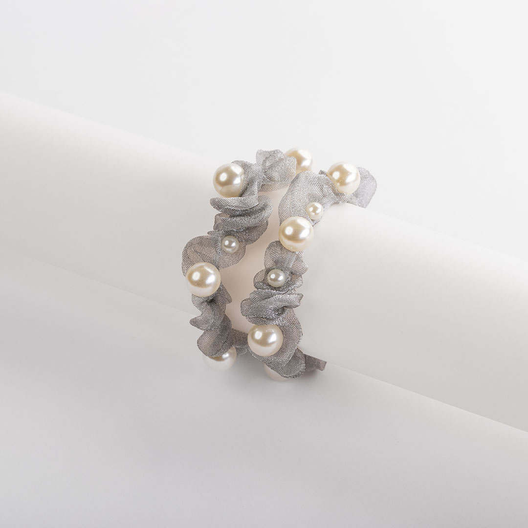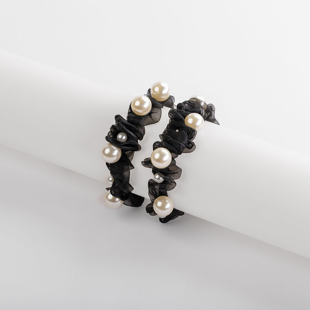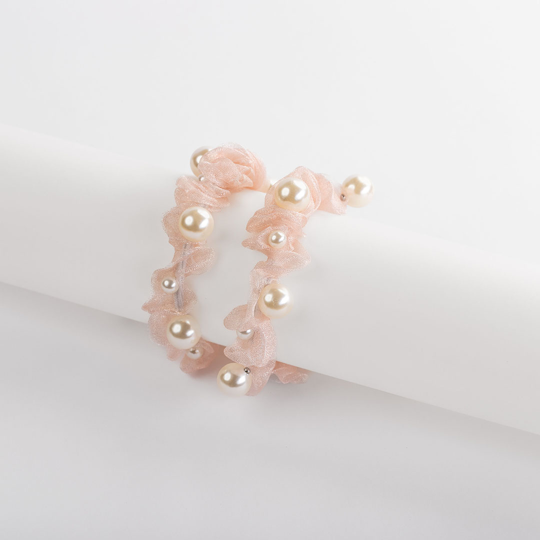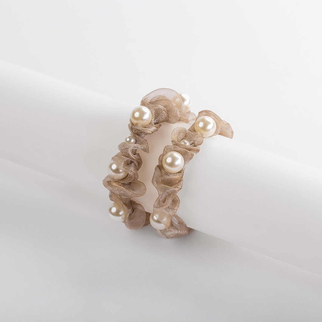 اسکرانچی توری مرواریدی با طراحی ظریف و مرواریدهای درخشان، به موها زیبایی و درخششی خاص می‌بخشد. این اسکرانچی مناسب برای استایل‌های شیک و مجلسی است.